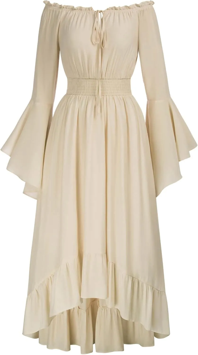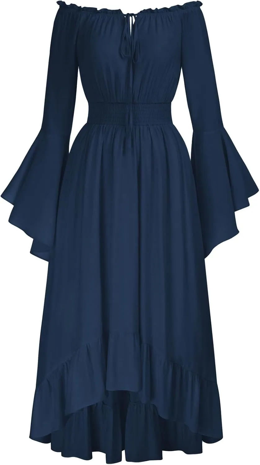 Renaissance Faire Costume Women Off Shoulder Long Bell Sleeve High Low Dress