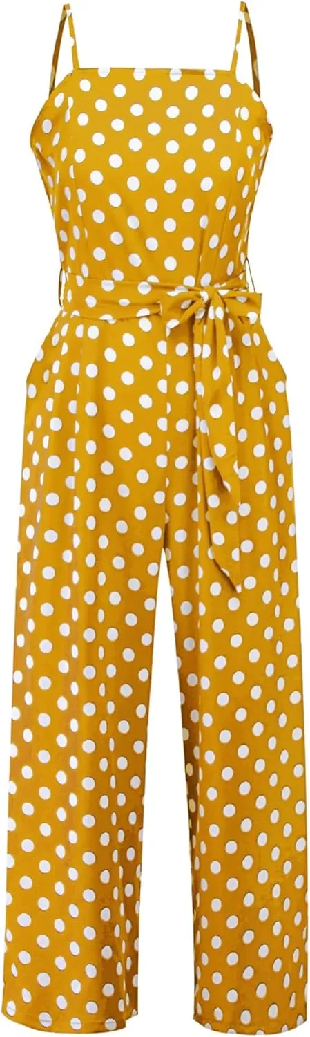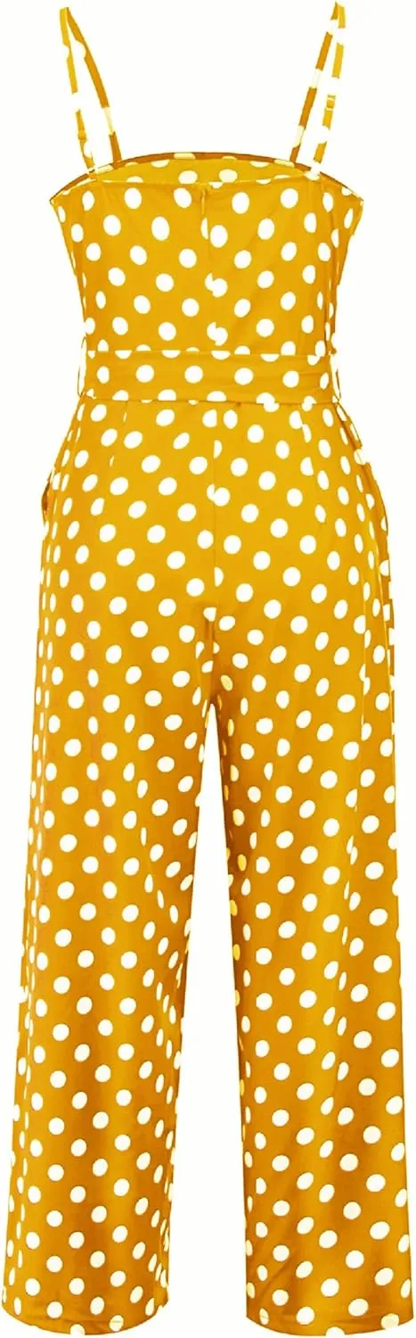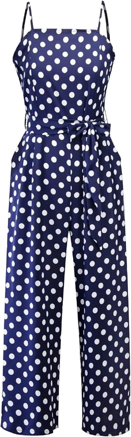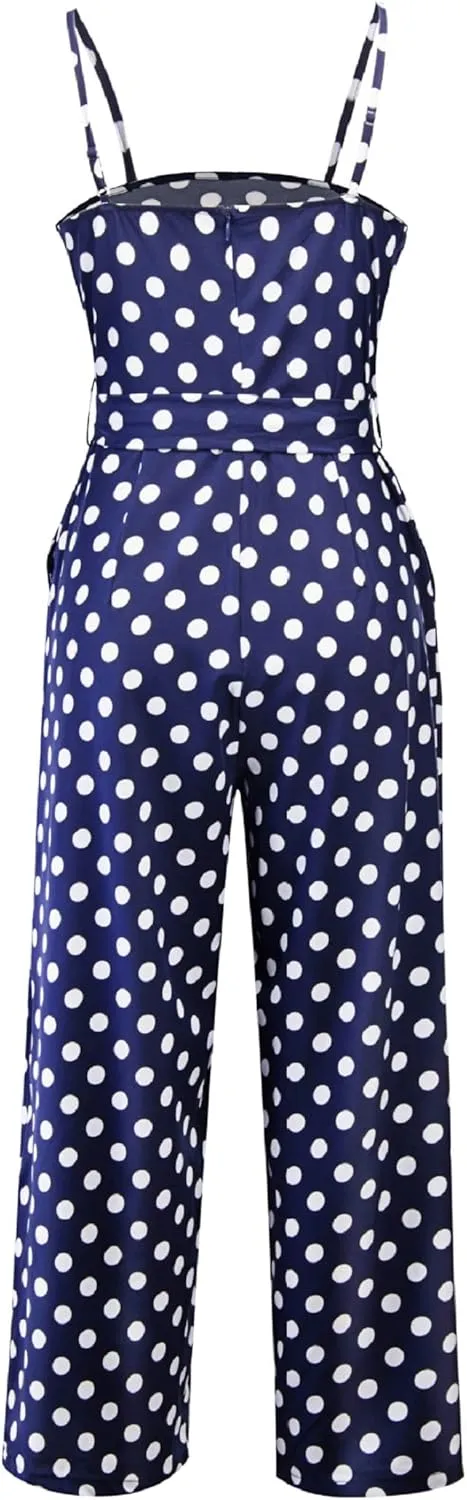 Women's Summer Spaghetti Straps Sash Polka Dot Wide Leg Palazzo Pants Jumpsuit