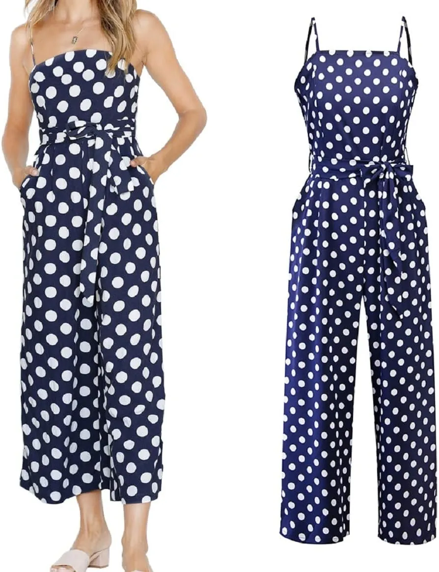 • Women's Summer Spaghetti Straps Sash Polka Dot Wide Leg Palazzo Pants Jumpsuit
